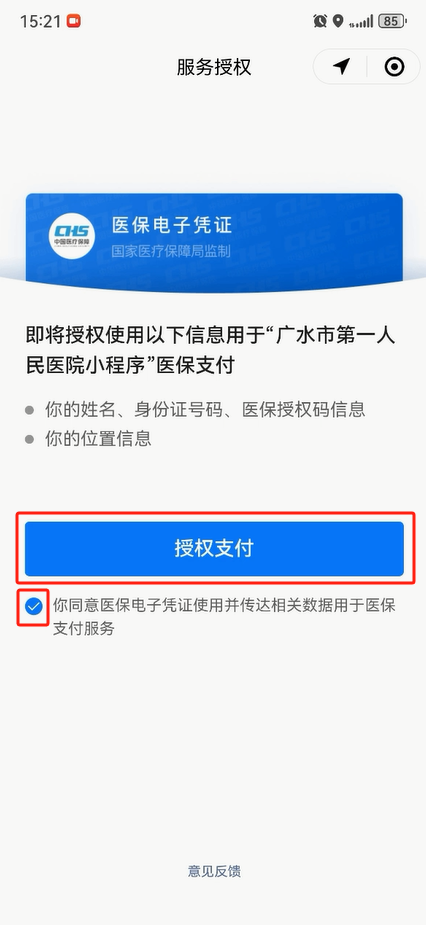 5、同意醫(yī)保電子憑證使用并傳達(dá)相關(guān)數(shù)據(jù)用于醫(yī)保支付服務(wù),勾選后點(diǎn)擊“授權(quán)支付”