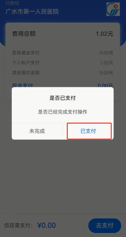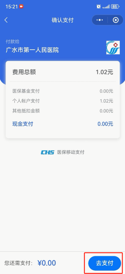 6、查看醫(yī)保預(yù)結(jié)算信息,點(diǎn)擊“去支付”